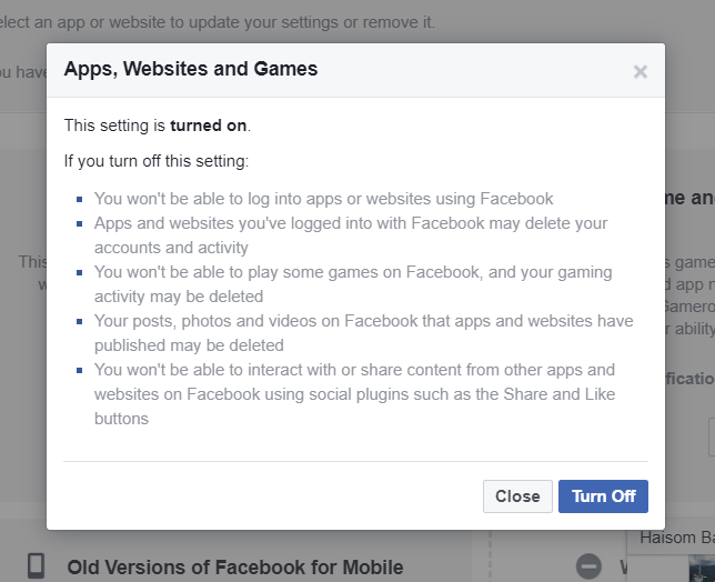 From there, click the “Edit” button under “Apps, Websites and Plugins.” Click “Turn Off.”